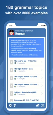 「Bootstrap Korean Grammar」は、185の文法トピックと3200以上の解説付きネイティブ音声例を収録。実績ある文法中心のアプローチで、正確かつ自信を持って韓国語を話せるようになります。