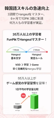 韓国語学習を、もっと早く、もっと楽しく、そして未来へ繋がる体験に変えませんか?FunPikは、ただの語学アプリの枠を超え、あなたの韓国語習得を強力にサポートします。ハングル初心者の方からTOPIK上級レベルを目指す方まで、誰もが効率的に目標を達成できるよう、モバイルに最適化された独自カリキュラムを提供。さらに、言語の壁を越え、文化、生活、ビジネスが融合したK-エコシステムを通じて、韓国との深い繋がりを築くK-プラットフォームを目指しています。
