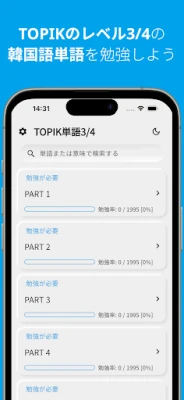 韓国語の学習に特化したアプリ「韓国語勉強、TOPIK単語3/4」。TOPIK試験の3級・4級合格を目指す方に最適な、厳選された単語が学べます。効率的な単語学習をサポートします。