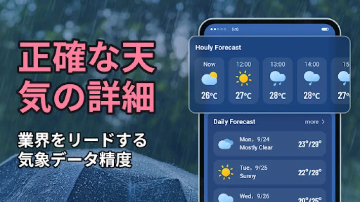 リアルタイムで正確な天気予報をいつでも入手。最新の気象状況を把握し、詳細な24時間予報で1時間ごとの天気も確認できます。常に正確な情報で、今日の計画を立てましょう。