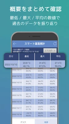 お手持ちのスマートフォンに『スマート温湿度計』アプリをインストールすれば、計測された温度と湿度の数値がリアルタイムで表示されます。一日の移り変わりが手に取るようにわかるグラフ機能で、部屋の環境変化を直感的に把握。過去のデータから、最低、最大、平均といった統計値も一目で確認できます。さらに、特定の期間のデータをCSV形式で書き出し、詳細な分析に活用したり、必要に応じて温湿度値を調整する校正機能も搭載。まるで専門家のような精緻な管理を、誰もが簡単に行えるよう設計されています。