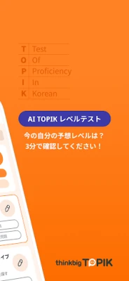 「thinkbig TOPIK」は、韓国の先進教育を牽引するWoongjin Thinkbigが開発した、TOPIKスコア向上に特化したAIベースの学習ソリューションです。画期的なAI技術を駆使し、あなたの現在の実力と目標を正確に把握。一人ひとりに最適化されたパーソナルカリキュラムで、TOPIK合格への道のりを最短かつ最も効率的にサポートします。AIの洞察が、あなたの潜在能力を最大限に引き出し、飛躍的なスコアアップへと導きます。