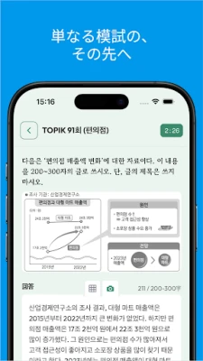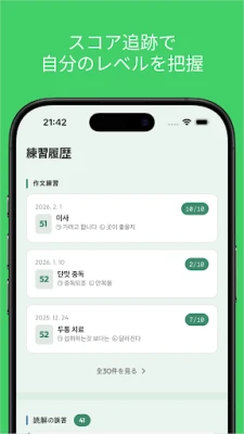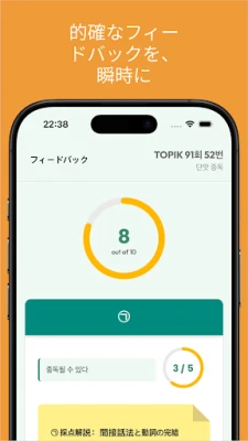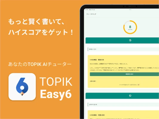 「TOPIK 쓰기 - Easy6」は、まさにポケットに収まるあなた専用のAIチューター。答案を提出するやいなや、高度なAIがリアルタイムで詳細なフィードバックを提供します。単なる間違いの指摘に留まらず、語彙の選択、文章構造の改善、論理的な展開といった、特に53番や54番で高評価を得るための戦略的アドバイスを具体的に提示。文法、スペル、助詞の誤りを正確に特定し、明確な修正案で文章力を根本から引き上げます。自分の文章が採点者からどう評価されるかを理解できるよう、予想スコア範囲も提示され、現在のレベルを客観的に把握することが可能です。